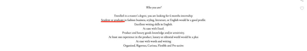 If you havenât completed any internships during your studies, or it wasnât in the fashion sector, or it lasted a few months, completing an internship at a luxury company is often requested and highly recommended.
