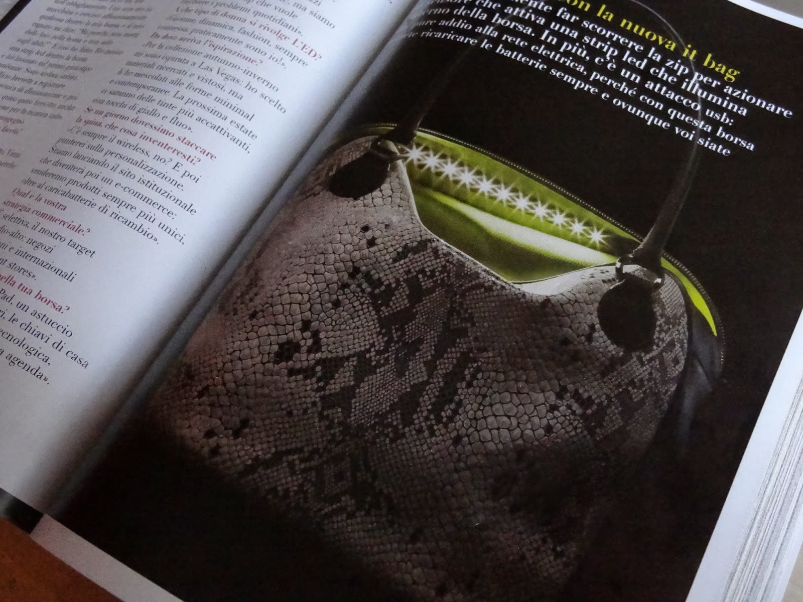 quando l’ho letta su Glamour ho pensato fosse l’idea del secolo! Ormai tutti viaggiamo quotidianamente con uno smartphone connesso perennemente ad internet, a fare scatti ogni volta che una cosa ci colpisce e questo implica la batteria del nostro Cellulare sempre a minimo! Oggi si è arrivati alla soluzione, certo esistono i porta cellulari incorporati di caricatore, ma andiamo, ammettiamo che caricare il cellulare da una delle nostre migliori amiche ( la borsa) è molto più straordinario! E se poi la borsa ha un design audace e quando si fa scorrere la zip si aziona un sensore che attiva una strip led che illumina l’interno della borsa, allora lì tutto è diverso! Quando dicevano che in una borsa è contenuto tutto il mondo di una donna allora avevano ragione!